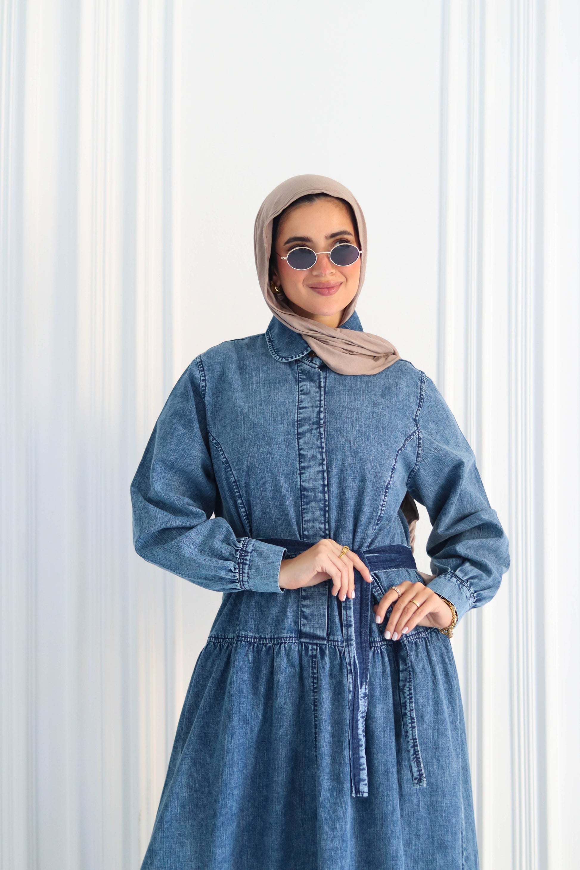 Modest denim maxi dress with a button-up front—casual yet elegant everyday wear.